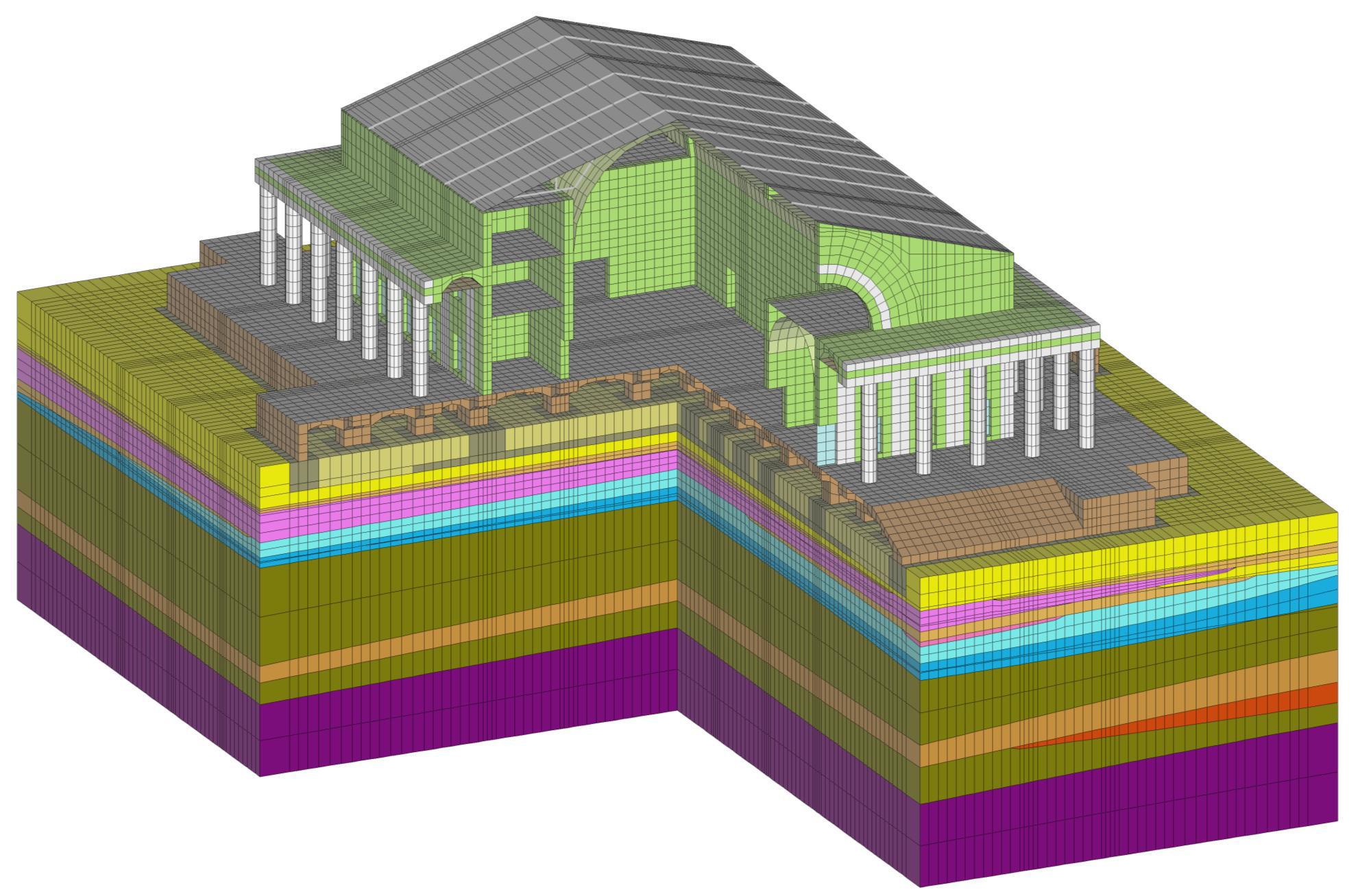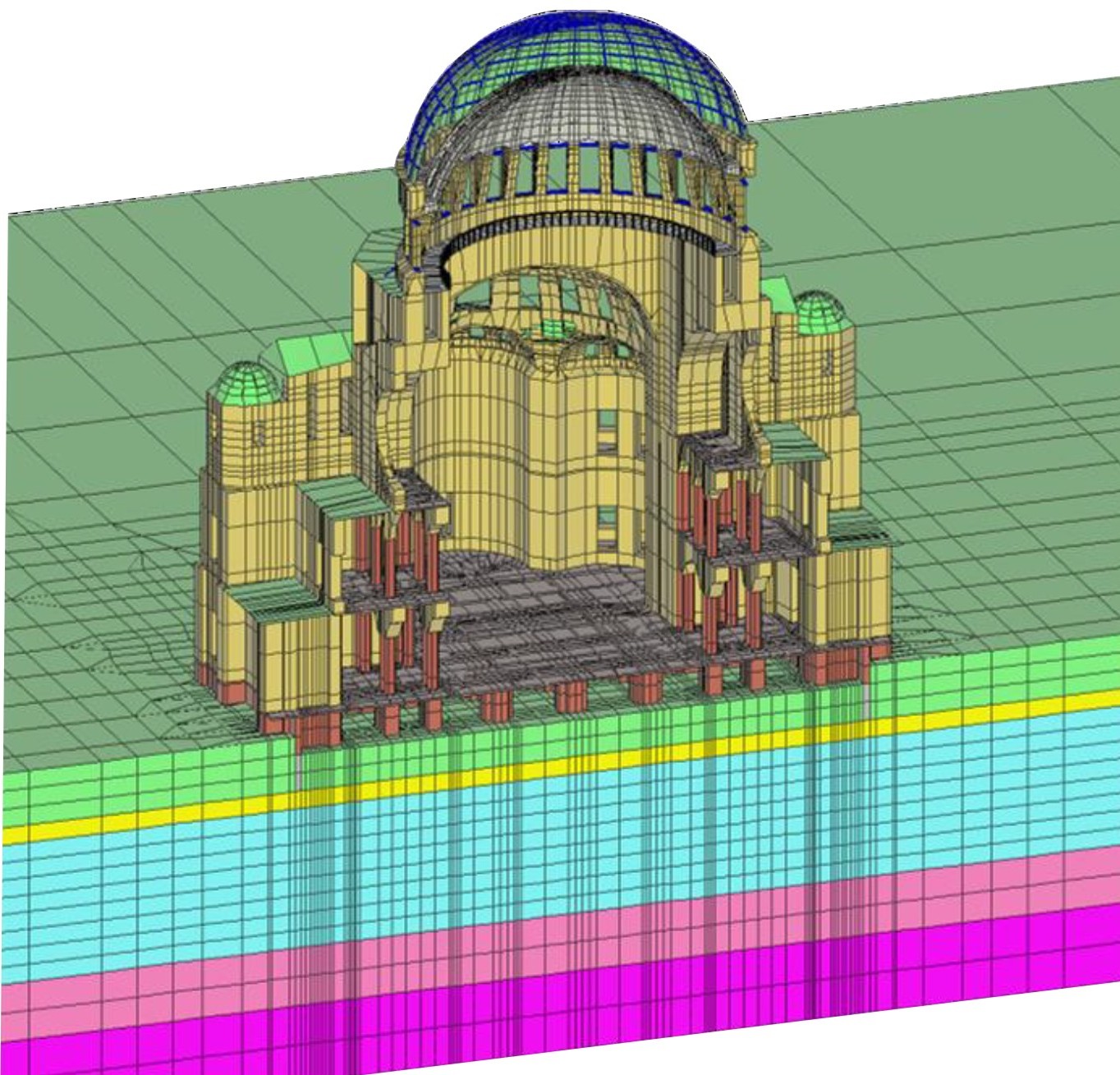 Мы создаем детальную компьютерную модель здания, его фундаментов и основания. Наиболее совершенным инструментом для этого является разработанная нами программа FEM-models, признанный лидер в совместных расчетах зданий и оснований. Вся информация о конструктивном решении здания, прочности его элементов, получаемая при обследовании становится базой исходных данных для построения расчетной модели памятника.