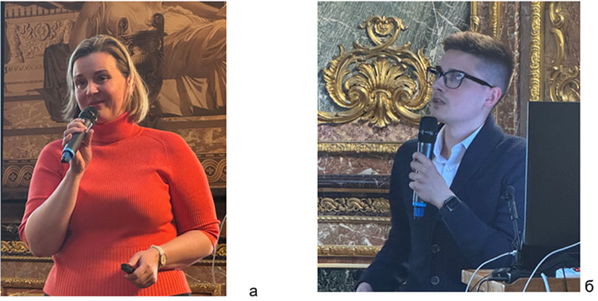 В завершение конференции прозвучали два доклада, в которых рассматривались вопросы сейсмических воздействий на сооружения: Любови Николаевны СМИРНОВОЙ (НИЦ «Строительство», Москва) «Особенности учёта неоднородности поля ускорений по длине протяжённого сооружения при сейсмическом воздействии» (фото 10а) и совместный доклад Татьяны Александровны БЕЛАШ (НИЦ «Строительство») и Даниила Сергеевича ФИЛИМОНОВА (СПбГАСУ, институт «Геореконструкция») «Сейсмостойкость гражданских зданий на многолетнемерзлых грунтах при сейсмических воздействиях различного частотного состава» (фото 10б).